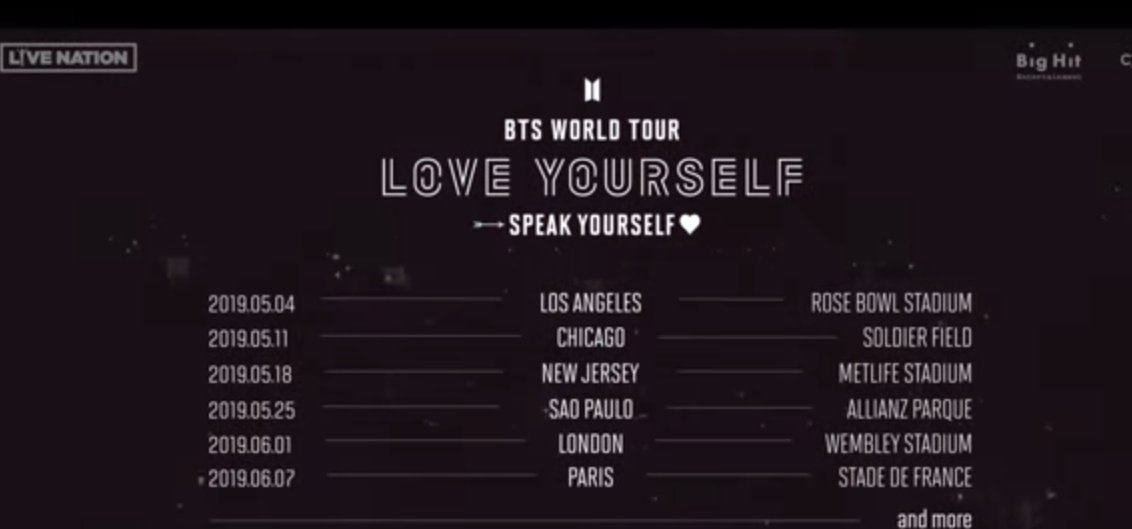 BTS performing during the Love Yourself World Tour in 2019 the bands biggest tour to date. Sobre esto destacó el caso de Colombia y México en Twitter pues serían los países más cercanos de BTS en el tour del 2020 ya que estarían en los Estados Unidos pero después dejaron los días 13 y 14 de junio sin una sede confirmada lo que desató las publicaciones de redes sociales con un llamado del ARMY para Big Hit Entertainment el cual hacía una petición de ser incluidos en el Map Of The Soul tour.